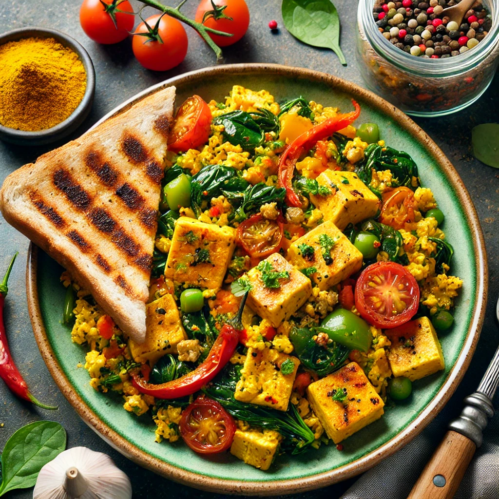 신선한 채소와 함께 곁들인 고소한 두부 스크램블