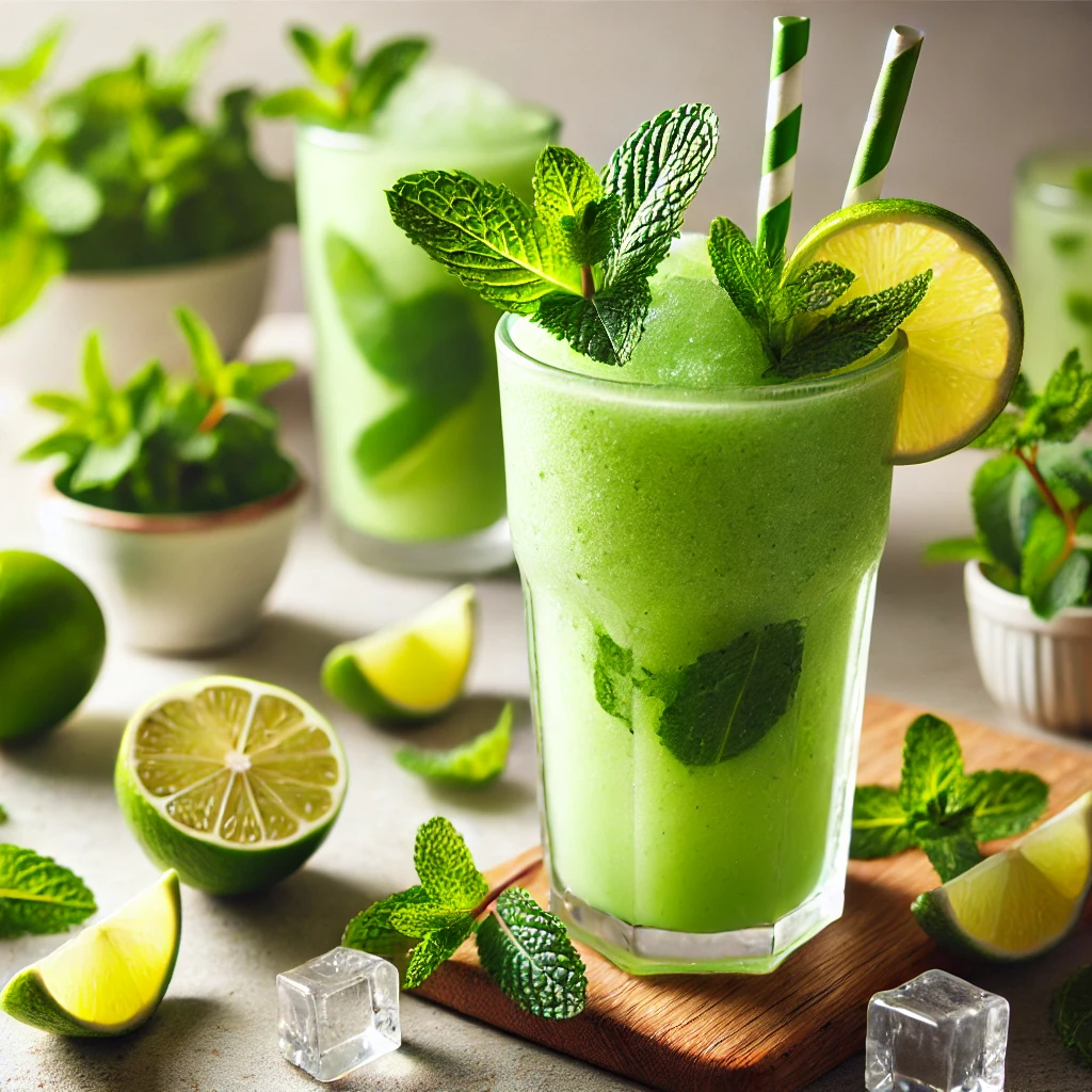 - 믹서기에 민트 잎, 라임 주스, 설탕, 얼음을 넣고 곱게 갈아줍니다.
