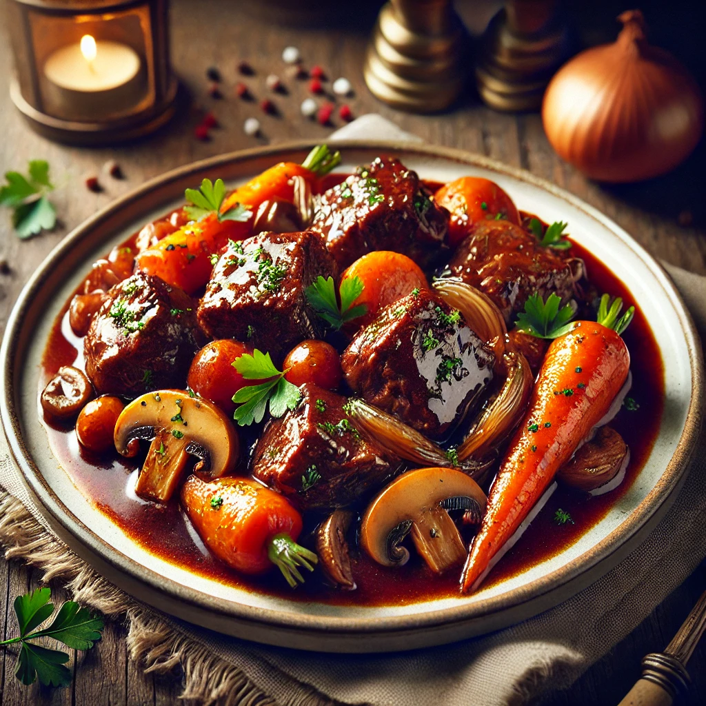 프랑스 요리의 정수를 보여주는 뵈프 부르기뇽은 레드와인에 장시간 조리한 소고기 요리입니다. 깊고 풍부한 맛이 일품이죠.