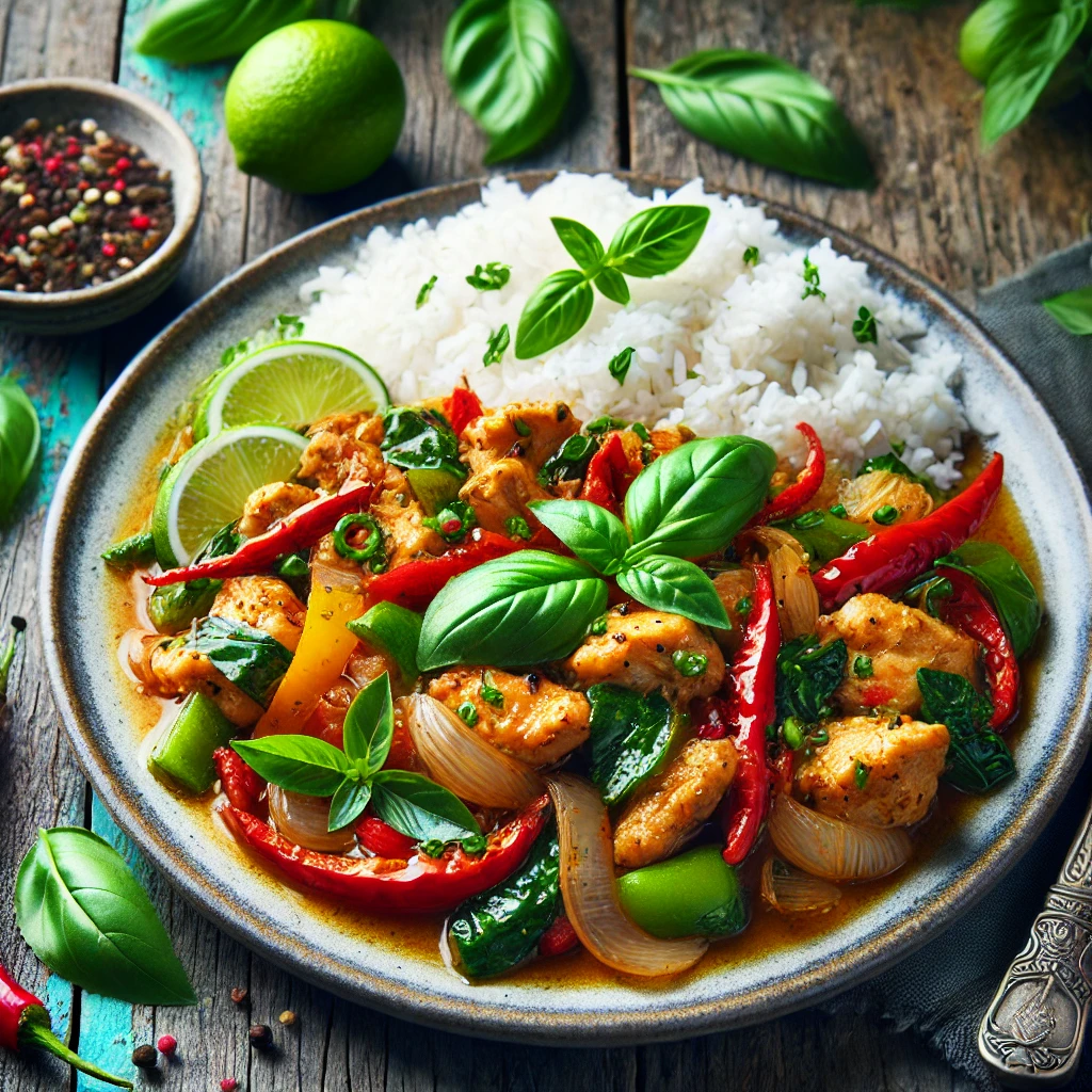 타이 바질 치킨은 태국의 대표적인 요리 중 하나입니다. 향긋한 타이 바질의 향과 매콤한 맛이 어우러져 독특한 풍미를 자랑하죠. 간단하면서도 이국적인 맛을 즐기고 싶을 때 제격인 요리입니다.