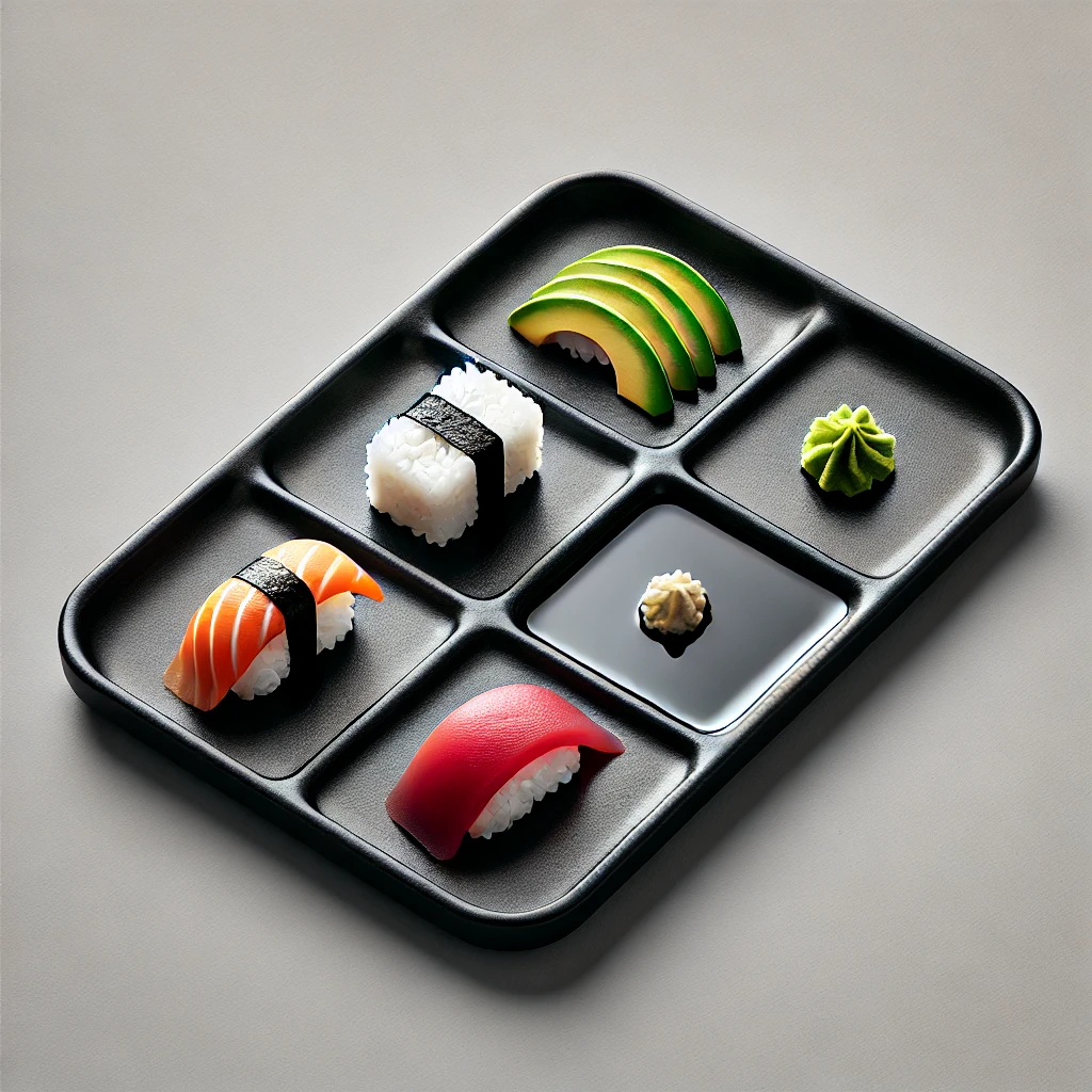 - 색상의 대비를 활용하세요. 검은 접시 위의 하얀 밥, 붉은 참치, 분홍 연어, 초록 아보카도가 선명한 대비를 만들어냅니다.