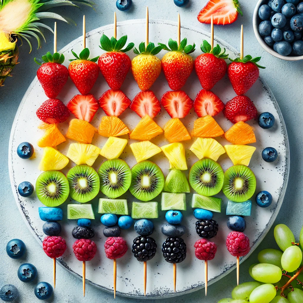 - 꼬치에 빨강(딸기), 주황(오렌지), 노랑(파인애플), 초록(키위), 파랑(블루베리), 보라(포도) 순서로 과일을 꽂습니다.