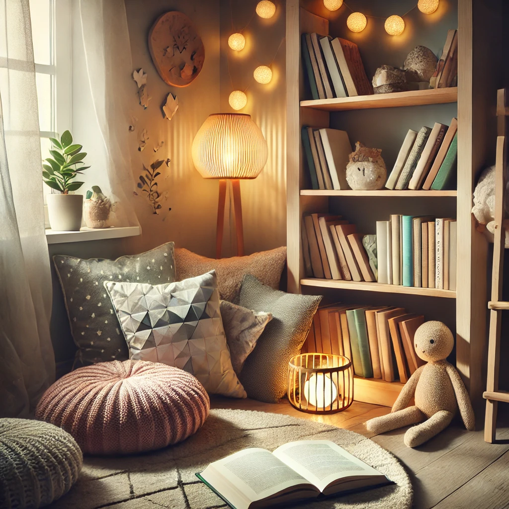 아이의 방 한켠에 아늑한 독서 공간을 만들어보세요. 푹신한 쿠션, 따뜻한 조명, 그리고 아이의 손이 닿기 쉬운 곳에 책장을 두세요. 이곳이 아이에게는 상상의 나라로 가는 비밀 통로가 될 거예요.
